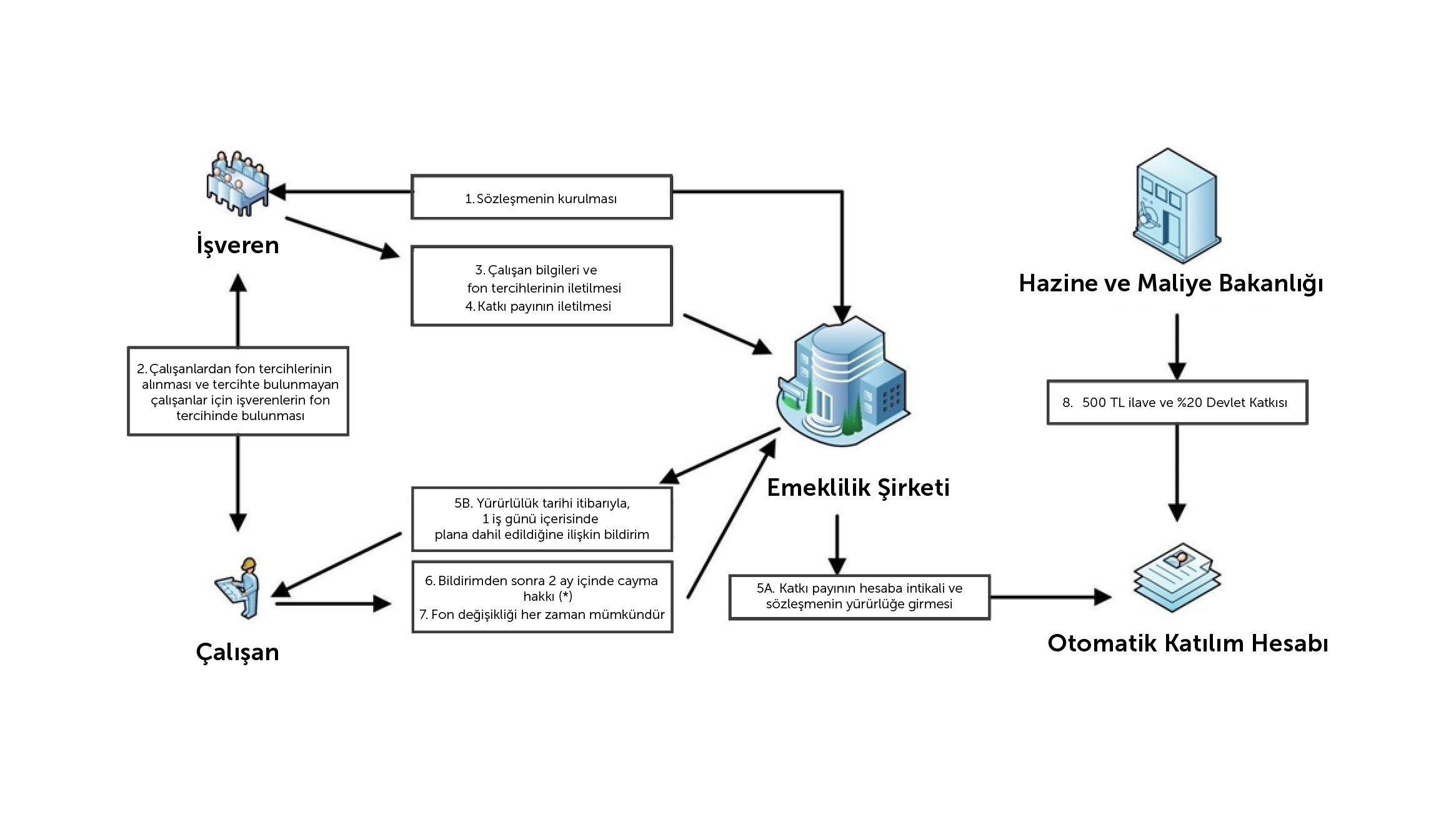 (*) Çalışan ilk 2 ay olan başlangıç döneminde cayma hakkını ve sonrasında herhangi bir anda sistemden ayrılma hakkını kullanabilir. Başlangıç dönemi içinde, katkı paylarının değer kaybetmeme garantisi vardır.