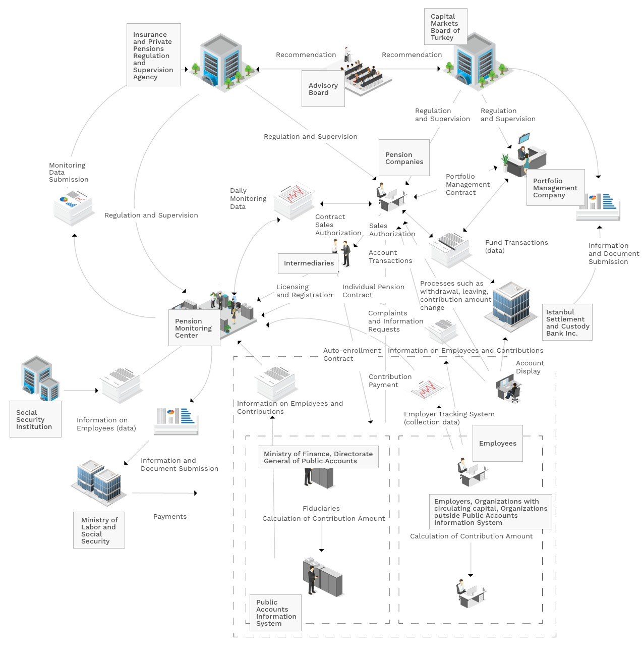 Legislative arrangements and system development studies regarding AES are carried out by Insurance and Private Pension Regulation and Supervision Agency (IPRSA). The companies that will operate in the system are licensed by the said Authority. The institution oversees the activities of pension companies and Pension Monitoring Center.