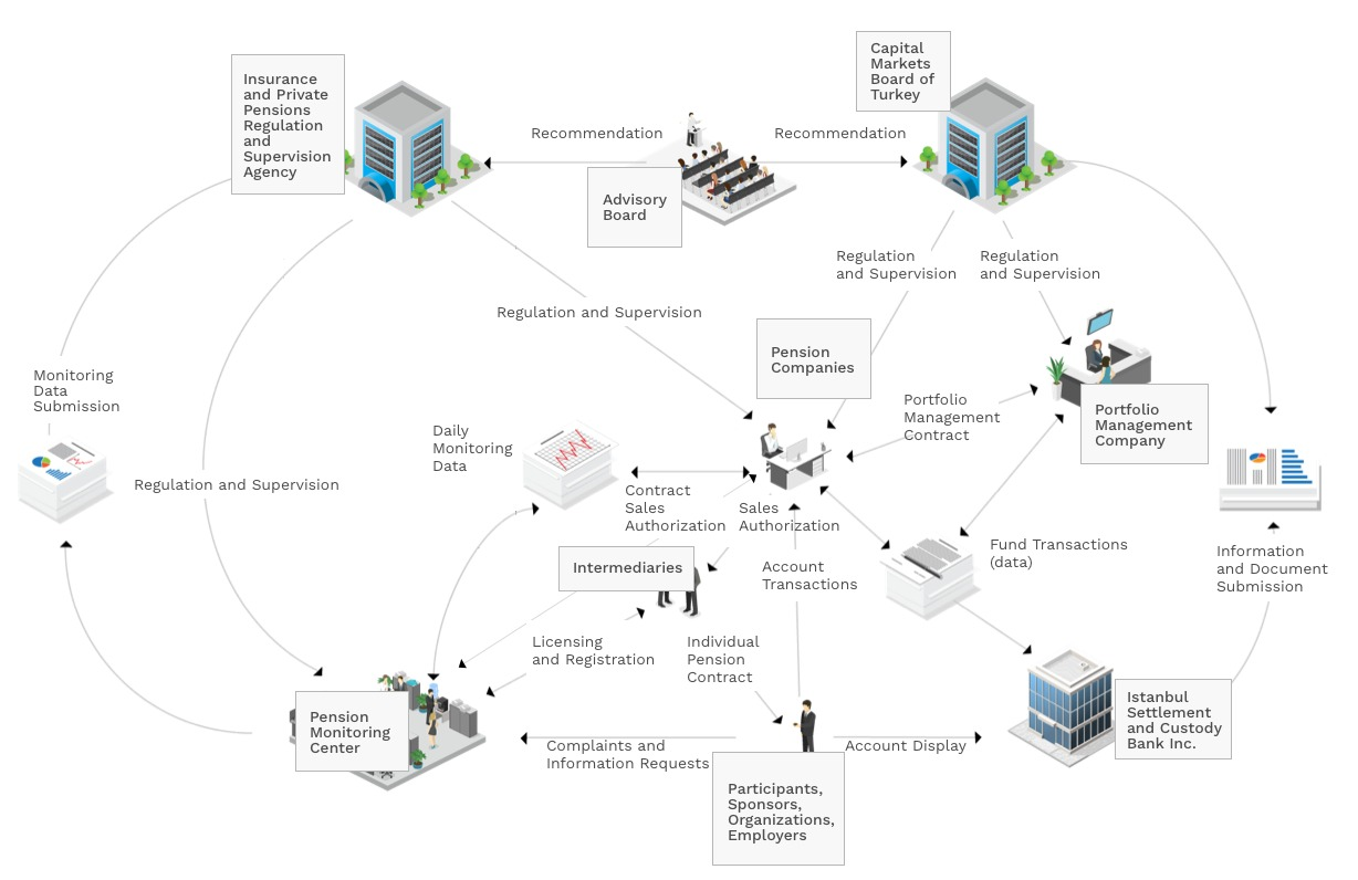 Legislative arrangements and system development studies regarding IPS are carried out by Insurance and Private Pension Regulation and Supervision Agency (IPRSA). The companies that will operate in the system are licensed by the said Authority. The institution oversees the activities of pension companies and Pension Monitoring Center.